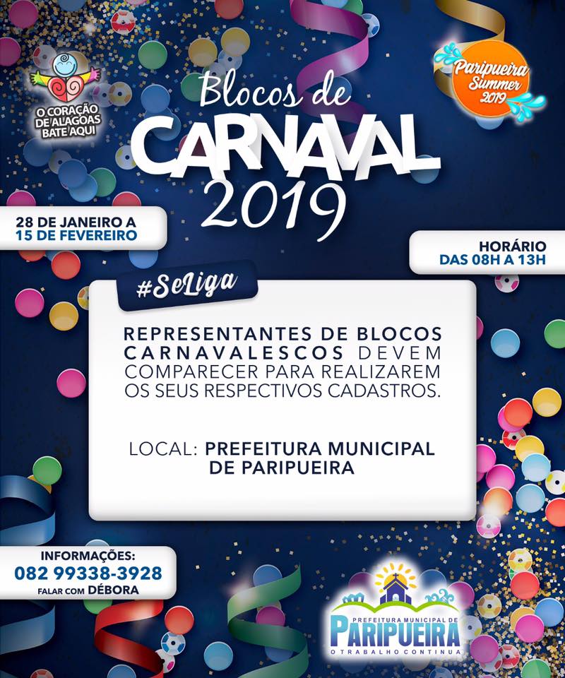 A Prefeitura de Paripueira está cadastrando os blocos de carnaval que desfilarão este ano. Segundo o prefeito Haroldo Nascimento, só vão poder participar dos desfiles os que forem devidamente registrados pelo município, até o próximo dia 15 de fevereiro.